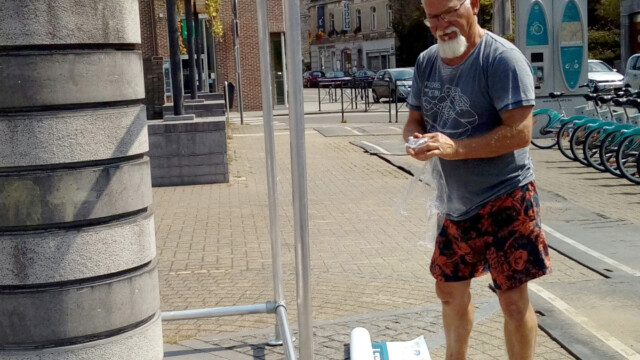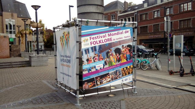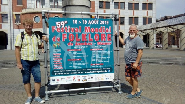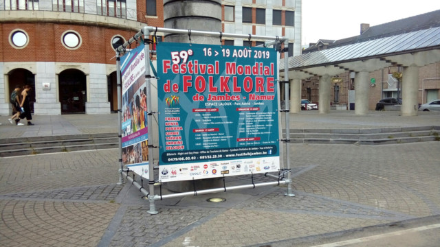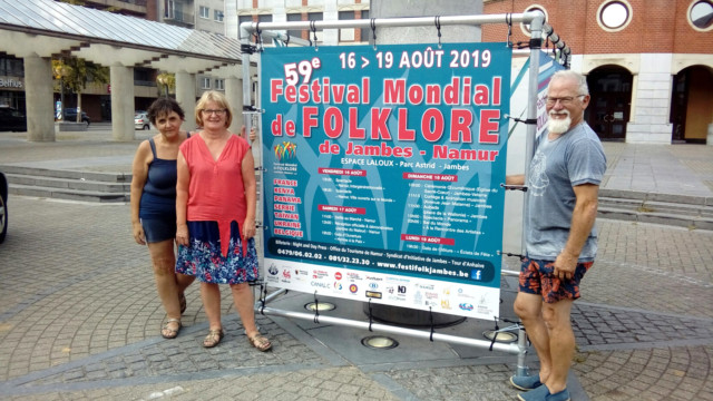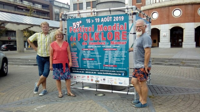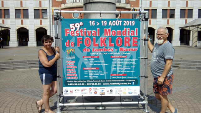 Çà y est…:) – La promotion s’organise 🙂 , placement du cube promotionnel du 59e Festival Mondial de Folklore de Jambes-Namur sur la Place de Wallonie à Jambes, sous l’œil attentif d’une des deux Co-présidentes, venue ravitailler en boissons, l’équipe technique au vu des fortes chaleurs….;) . Merci à Joseph, Jocelyne et Nikolaï.