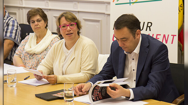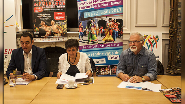 Le 24 juillet était organisée la conférence de presse du 57e Festival Mondial de Folklore en présence du Bourgmestre Maxime Prévot, de l’Echevine de la Culture Cécile Crèvecoeur, de co-présidentes Ann Leon et Teresa Rodriguez Rocha, du conseil d’administration et membres de l’asbl du Festival. Le Bourgmestre a réitéré son souhait de voir perdurer encore longtemps dans le ciel namurois, ce festival qui lui tient particulièrement à cœur. Il a également remercié tous les bénévoles qui contribuent à ce bel événement. Rendez-vous à Jambes, du 18 au 21.08.2017. Infos : www.festifolkjambes.be (Photos : D.Sizaire et A-P Huppertz).