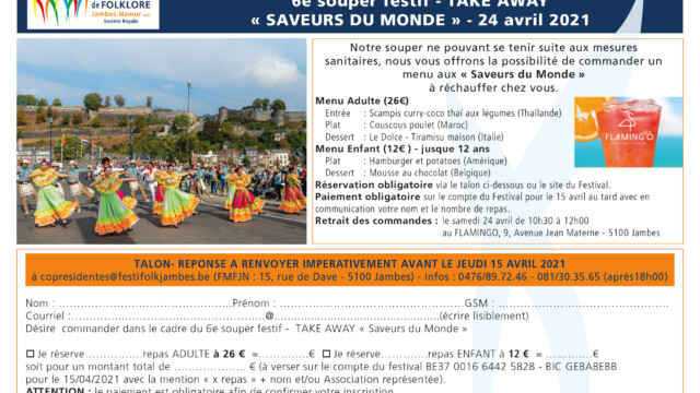 Ce 24 avril, le Festival a organisé son 6e souper « Saveurs du Monde » en mode « take away » en partenariat avec le restaurant « Le Flamingo », en soutien à l’Horeca.